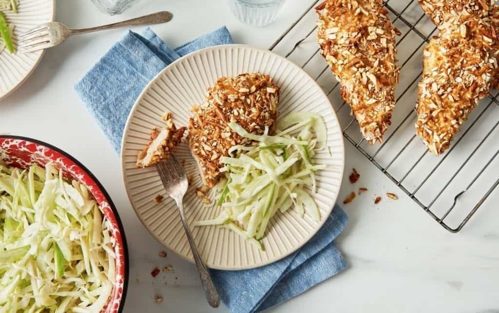 While the chicken cooks, prepare the slaw by whisking together the remaining 1 tbsp buttermilk, mayonnaise, and vinegar in a large bowl. Add the cabbage, apple, and fennel and toss to coat. Serve the chicken schnitzels with the slaw.